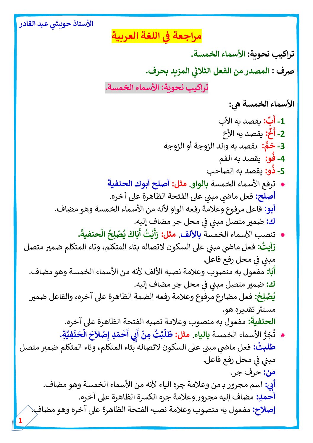أكمل القراءة »مراجعة في اللغة العربية حول الأسماء الخمسة مع الحل للأستاذ حويشي عبد القادر 5 ابتدائي