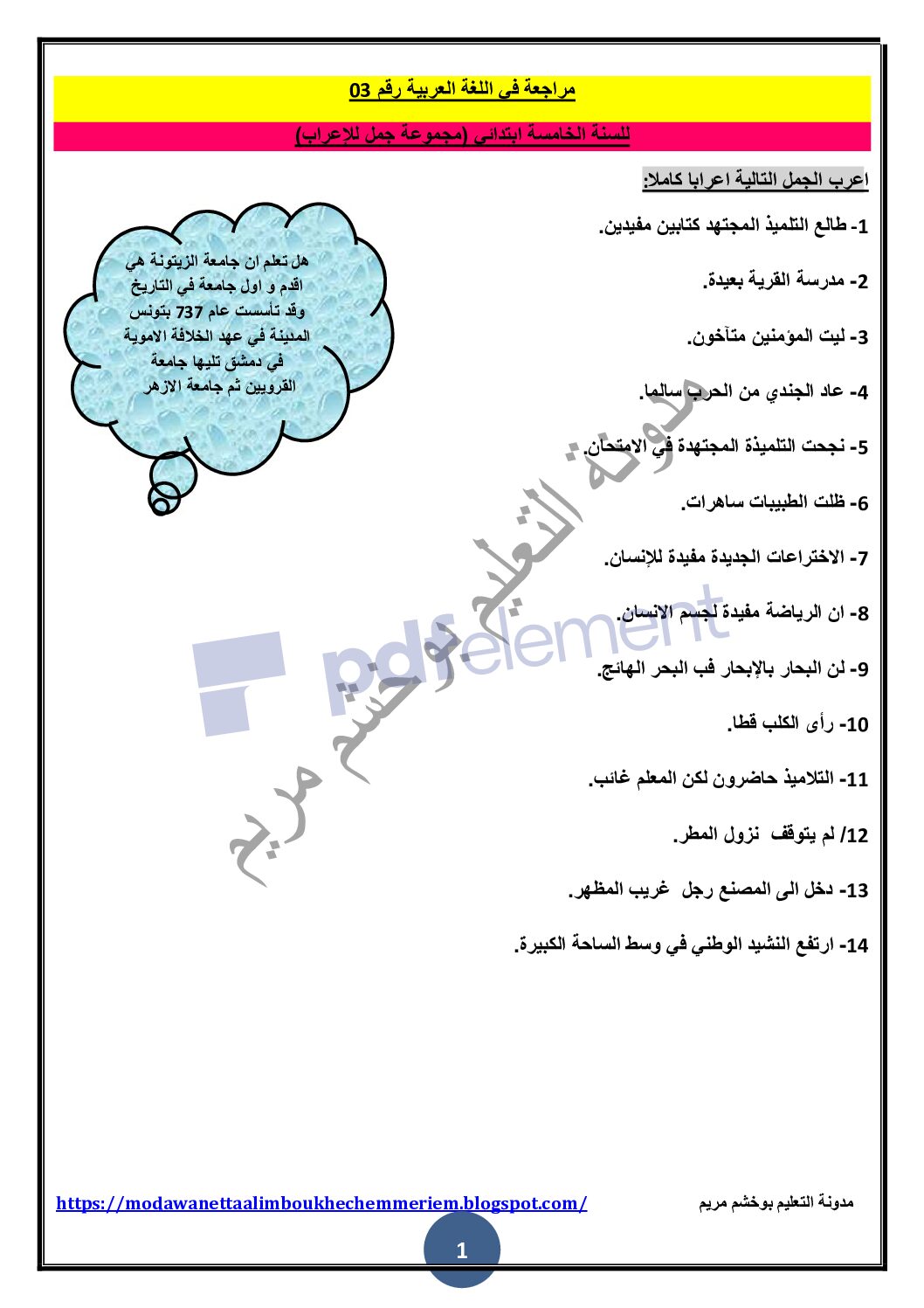مراجعة في اللغة العربية مجموعة جمل للإعراب 5 ابتدائي مادة اللغة العربية للسنة الخامسة 5 ابتدائي دروس مفصلة ، فروض واختبارات، تمارين محلولة: تقويم تشخيصي في اللغة العربية سنة خامسة ابتدائي يمكن تصفح الملف مباشرة عبر موقع الدراسة الجزائري أو تحميله مباشرة بصيغة PDF بالضغط أعلاه على: .: تحميل :. اللغة العربية السنة الخامسة ابتدائي