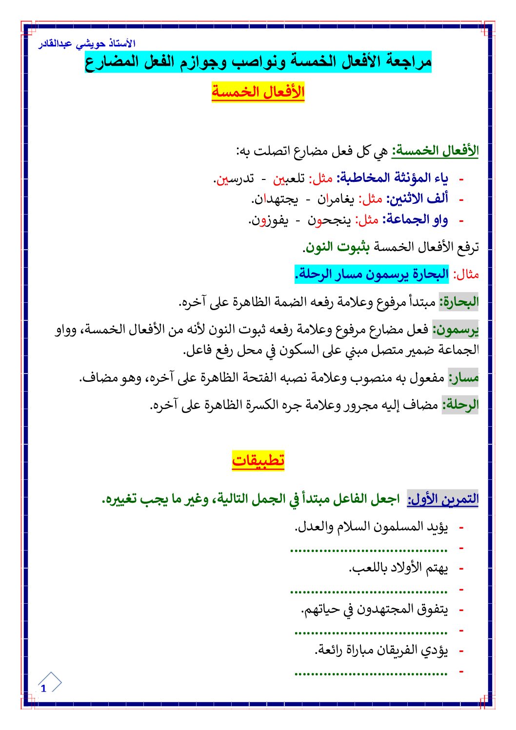 أكمل القراءة »مراجعة في اللغة حول الافعال الخمسة ونواصب وجوازم الفعل المضارع للاستاذ حويشي عبد القادر 5 ابتدائي