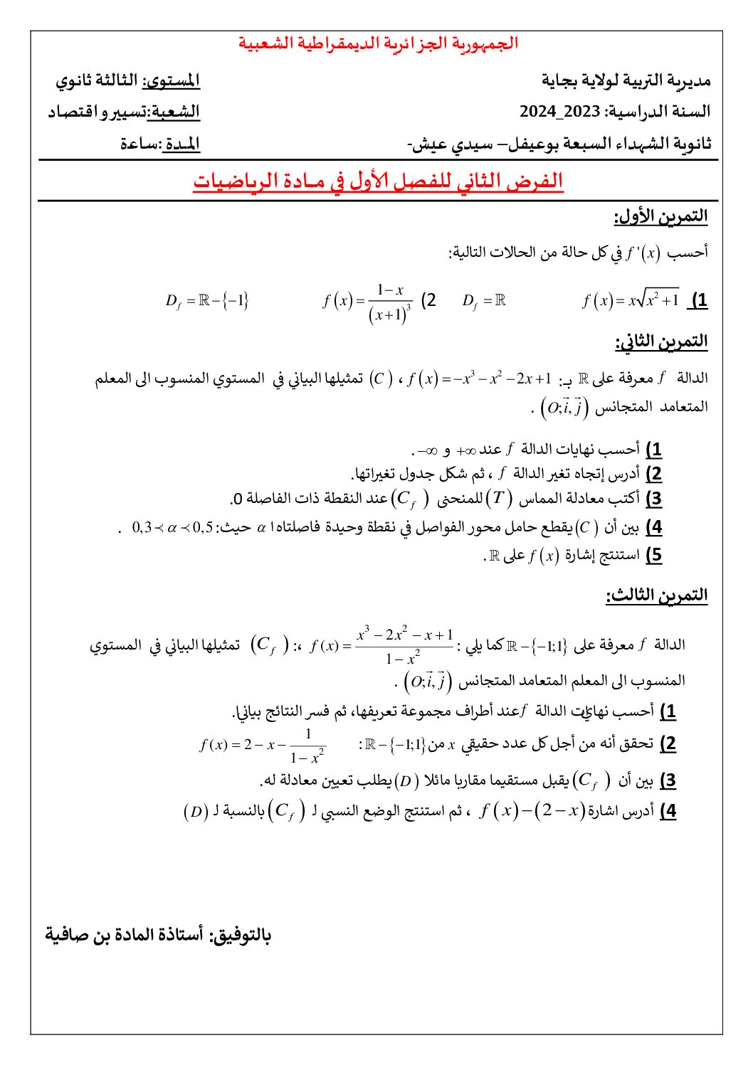 فروض الرياضيات 3 ثانوي تسيير واقتصاد الفصل الأول