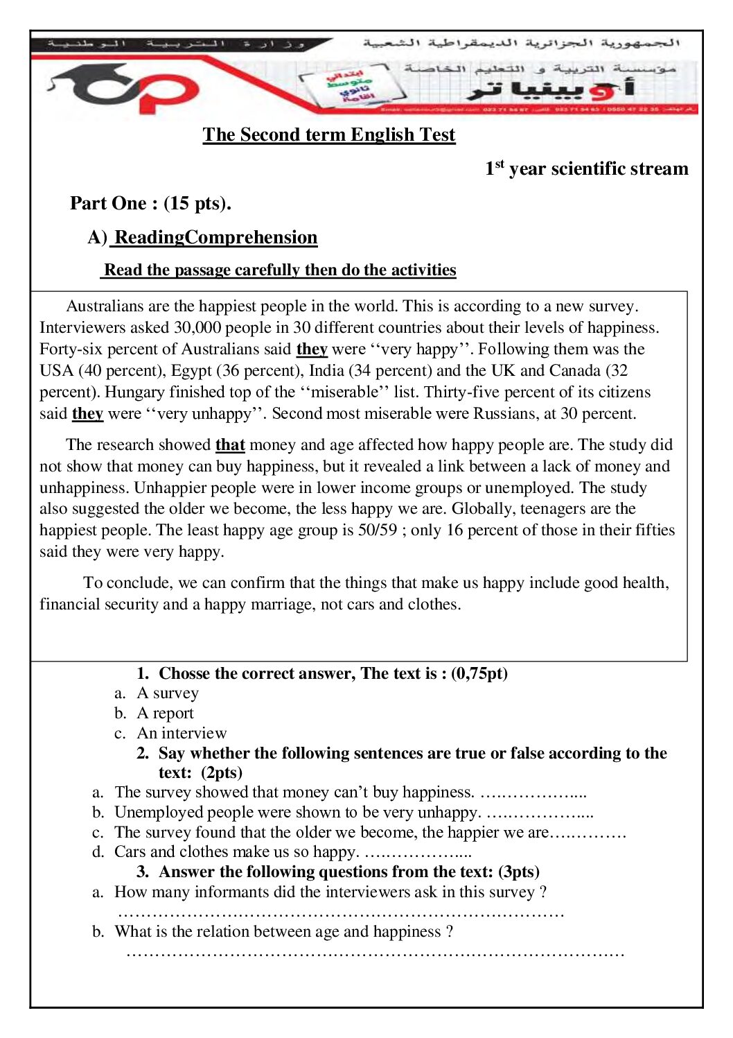 أكمل القراءة »فرض في اللغة الإنجليزية الفصل الثاني السنة الأولى ثانوي ج م ع رقم 2 مع التصحيح