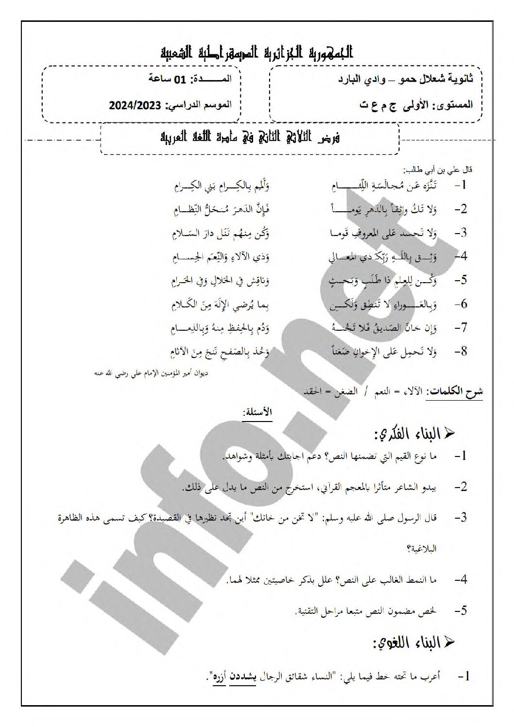 فرض في اللغة العربية الفصل الثاني السنة الأولى ثانوي ج م ع رقم 17 مع التصحيح