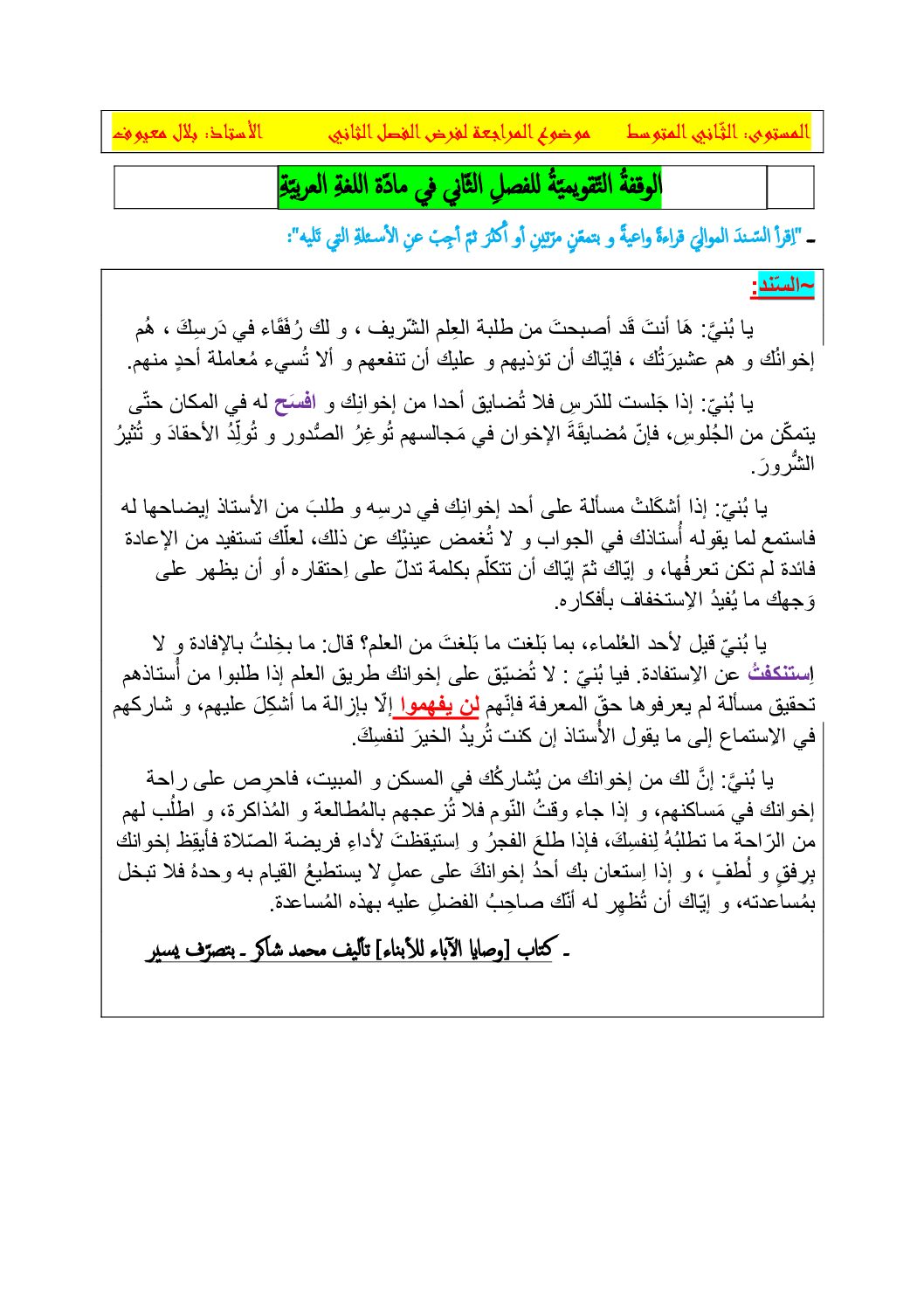 فروض اللغة العربية 2 متوسط الفصل الثاني