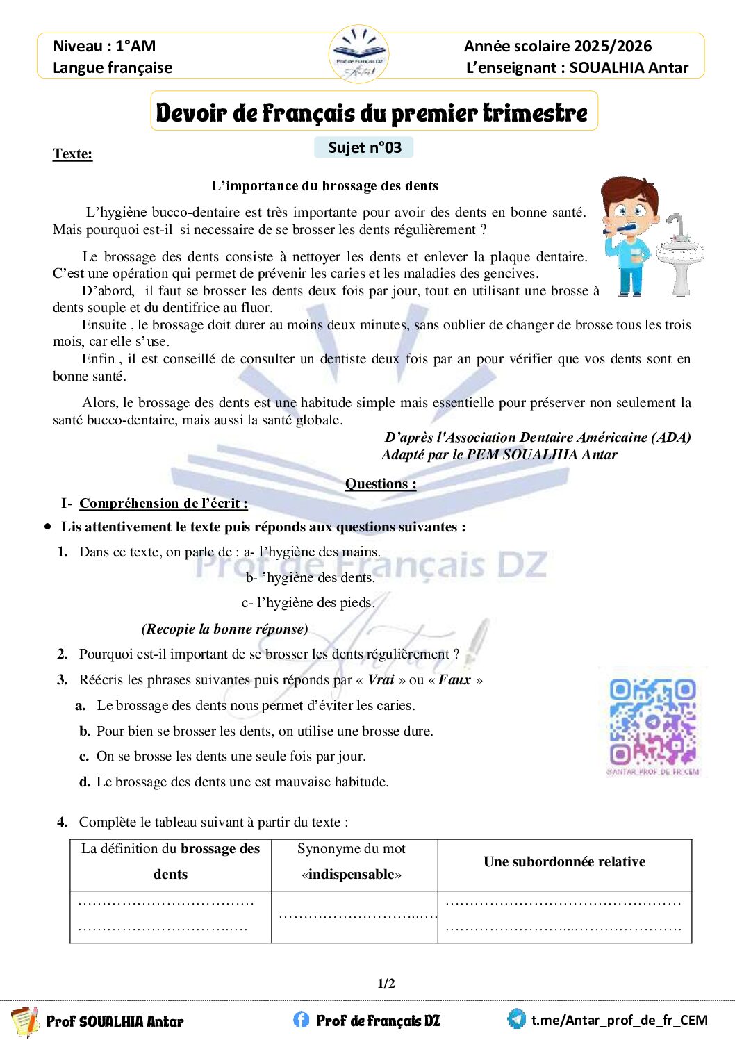 فرض في اللغة الفرنسية الفصل الأول السنة الأولى متوسط رقم 72 مع التصحيح