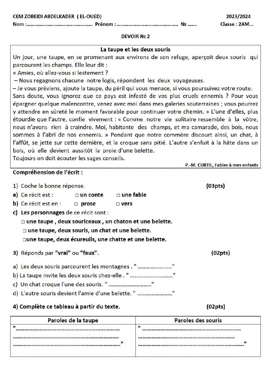 فرض في اللغة الفرنسية الفصل الثاني السنة الثانية متوسط رقم 48 مع التصحيح