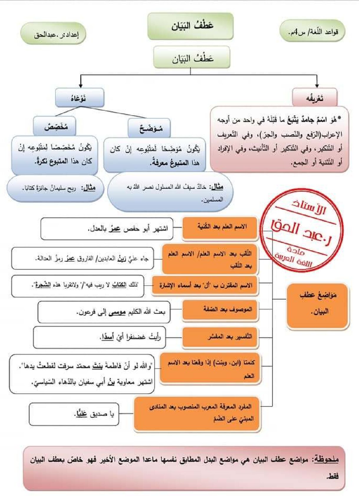 ملخص عطف البيان في مادة اللغة العربية للأستاذ عبد الحق 4 متوسط