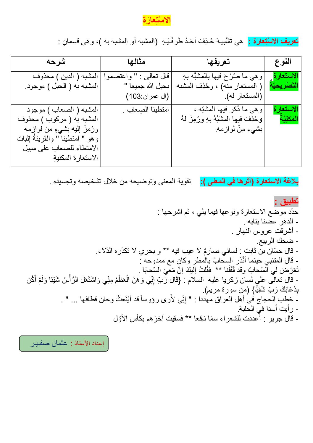 ملخص درس الاستعارة في اللغة العربية للأستاذ عثمان صفير 4 متوسط