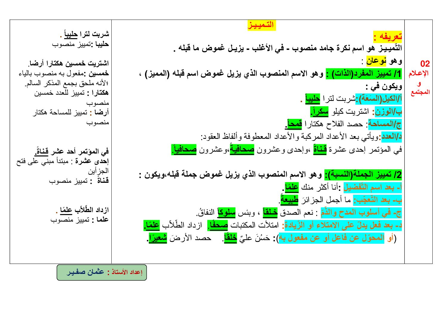 ملخص درس التمييز في اللغة العربية للأستاذ محمد صفير 4 متوسط