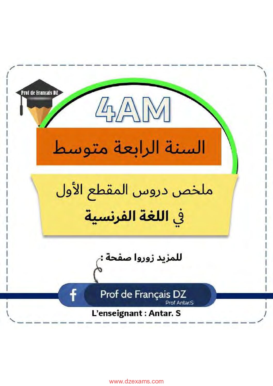 ملخص المقطع 01 في اللغة الفرنسية للاستاذ عنتر 4 متوسط