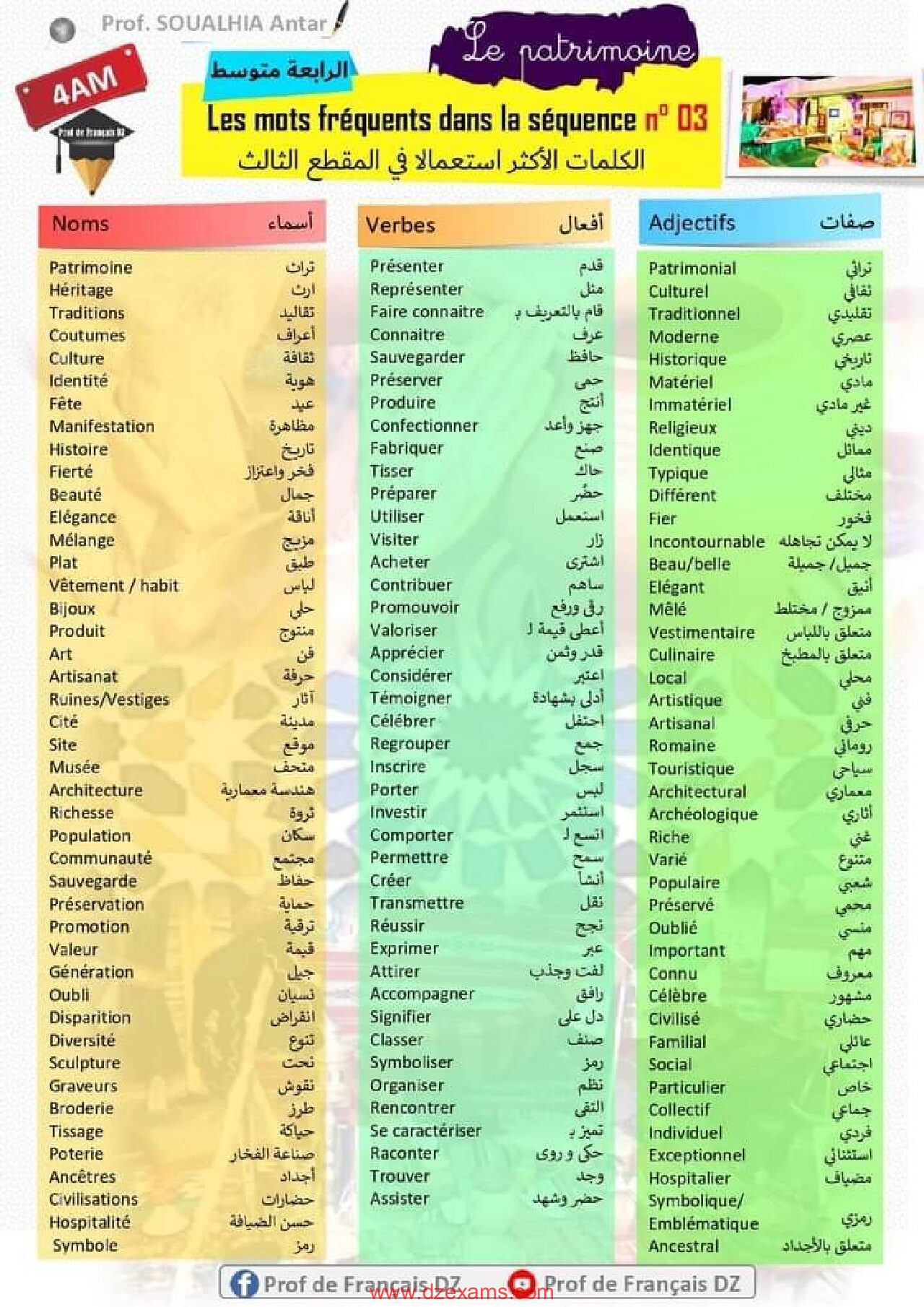 الكلمات الاكثر استعمالا في المقطع 03 في الفرنسية للاستاذ صوالحية عنتر 4 متوسط