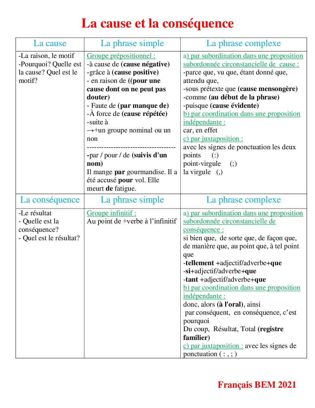 جدول ملخص في اللغة فرنسية 4 متوسط La cause et la consquence