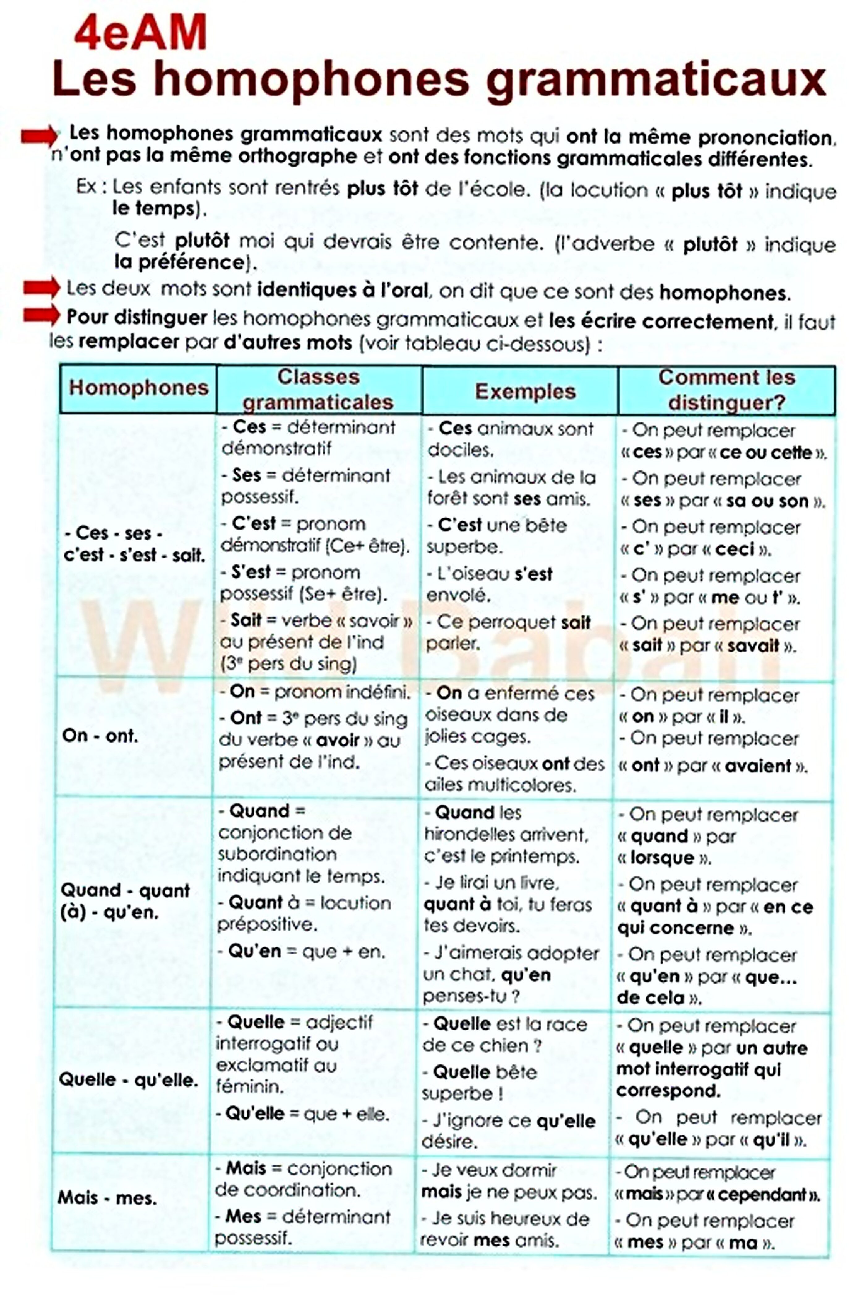 جدول ملخص في اللغة فرنسية 4 متوسط Les homophones grammaticaux